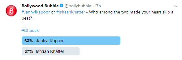 Yesterday, Karan Johar’s Dharma Productions released the posters of their upcoming film ‘Dhadak’ introducing the lead pair of Janhvi Kapoor and Ishaan Khatter. ‘Dhadak’ is the official Hindi remake of Marathi film ‘Sairat’ and marks the Bollywood debut of these two star-kids. Praises poured in from all corners for these two newbies and Bollywood stars welcomed these two with open arms. Both Ishaan and Janhvi started trending on Twitter and so did the film. We ran a Twitter poll asking their fans to pick one out of the two, who managed to leave a mark in the posters. (Also Read: Dhadak: Janhvi and Ishaan soak in moments of love in the latest poster)