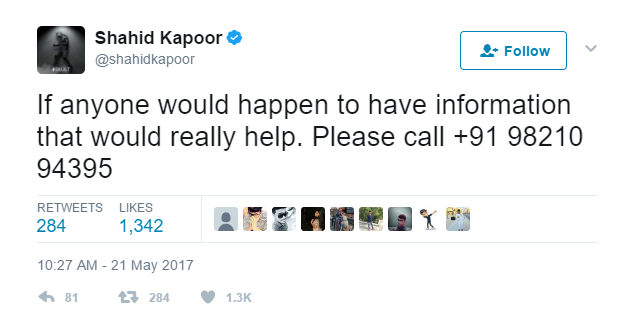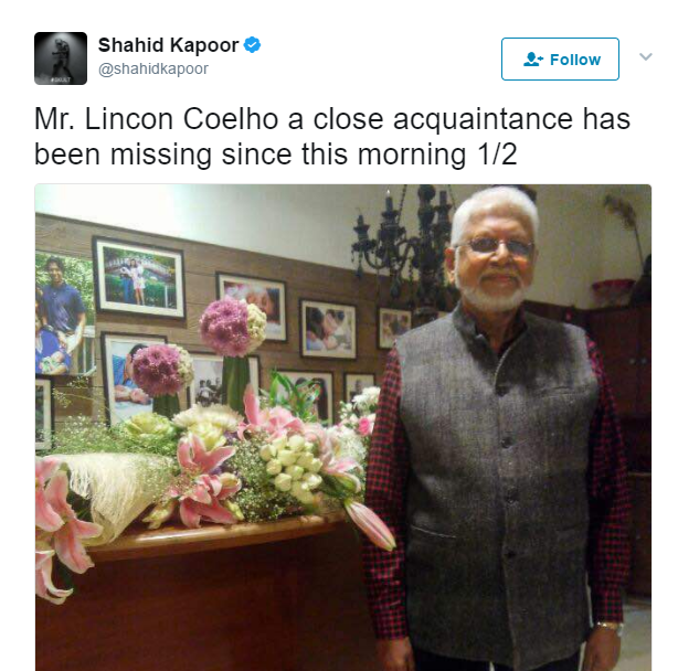 Last night, we came across Shahid Kapoor‘s tweet wherein he urged his followers to help find a ‘close acquaintance’ who has gone missing since yesterday morning. Mr Lincoln P Coelho, a veteran gynaecologist practising out of Mumbai, can not be traced since 9:50 am on May 21.