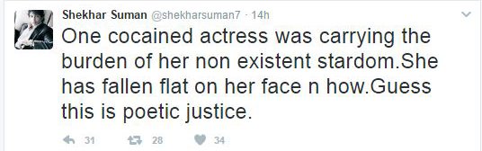 He gave clarification on his tweets by saying, “I didn’t talk about a cocained actress. Cocaine is just a metaphor in the sense it is a general statement for all those actors and actresses, primarily for those whose success has gone to their heads. Cocaine means you know, feeling high about your success.”