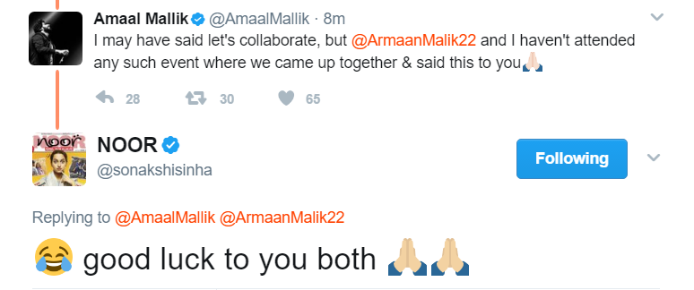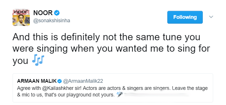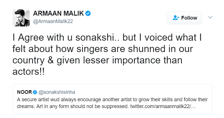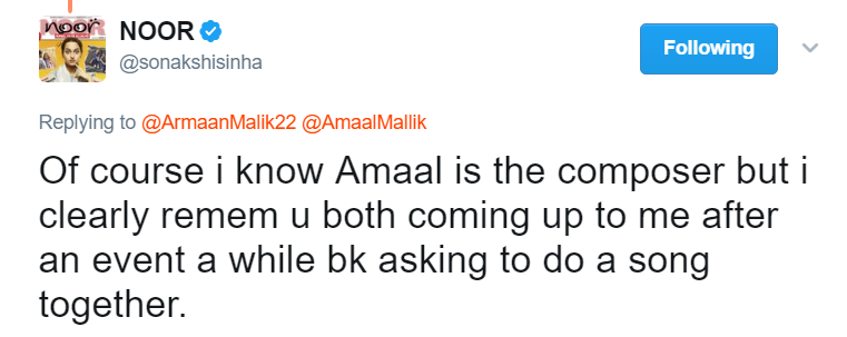 This further started a Twitter war between the two as Armaan thought she mistook him for his brother Amaal whereas Sonakshi said she clearly remembers that the duo had met her at an event, asking her to sing for them. The two denied the same. Have a look at their tweets below: