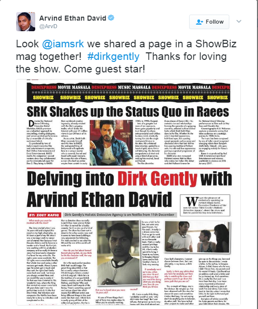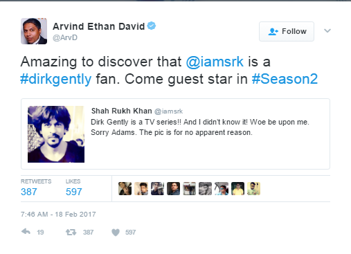 Now we know that Shah Rukh is one of those personalities who is most active on Twitter. So once, SRK randomly tweeted about Dirk Gently and hola! His tweet got noticed! Arvind Ethan David who is the executive producer of this detective show, caught hold of Shah Rukh Khan’s tweet and instantly invited him to be a guest star on the show.
