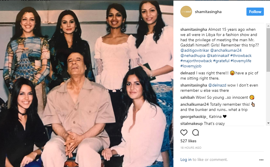 “Almost 15 years ago when we all were in Libya for a fashion show and had the privilege of meeting the man Mr. Gaddafi himself! Girls! Remember this trip?? @aditigovitrikar @anchalkumar24@nehadhupia @katrinakaif #throwback#majorthrowback #grateful #lovemylife#lovemyjob,” [sic] she wrote.