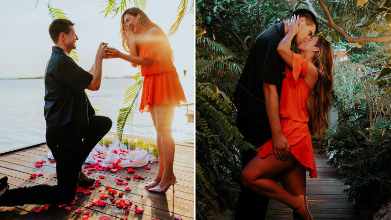 In the pictures, Tobias goes down on his knees as he popped the question with a ring in his hand. She also dropped some pictures of her steamy kiss with Tobia. During the proposal, Lauren is seen wearing an orange off-shoulder dress. She also flaunts her beautiful diamond ring. The proposal seems straight from a true blue Bollywood film with rose petals, a sunset view and a beach. Since the proposal happened in Aruba, Lauren also gives a glimpse into their honeymoony bedroom which is decorated with rose petals.