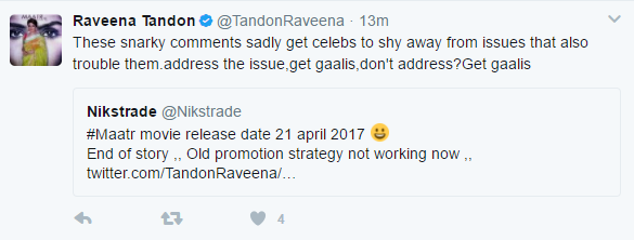 A genuine concerned raised by Raveena. But someone called it a publicity gimmick, just because her film ‘Maatr’ is releasing soon.