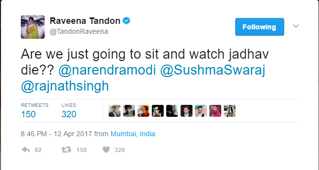 So in support of Yadav, Raveena had tweeted, “Are we just going to sit and watch jadhav die?? @narendramodi @SushmaSwaraj @rajnathsingh” [sic]