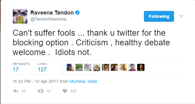 Following this, she also posted, “Can’t suffer fools … thank u twitter for the blocking option . Criticism , healthy debate welcome . Idiots not.” [sic]