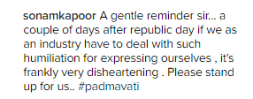 Sonam tweeted on a last year tweet of the PM, saying, “A gentle reminder sir… a couple of days after republic day if we as an industry have to deal with such humiliation for expressing ourselves, it’s frankly very disheartening. Please stand up for us. #Padmavati”