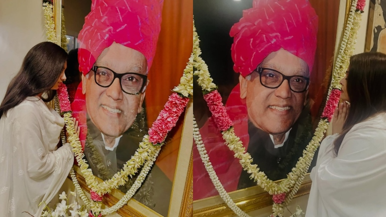 The actress shared images of her father’s framed portrait, adorned with a flower garland. In one photo, Aishwarya stands beside the portrait in a graceful white traditional outfit, gently touching the frame as she pays her respects. Another picture features young Aaradhya, also present during the tribute, softly touching her grandfather’s portrait.