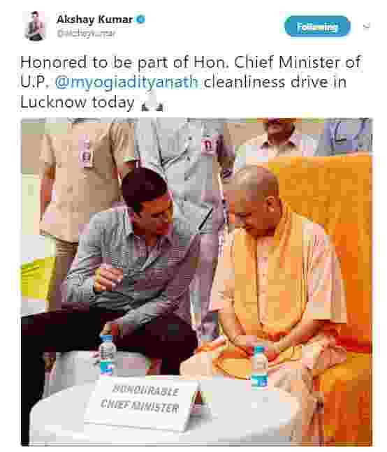 Akshay also tweeted, “Honored to be part of Hon. Chief Minister of U.P. @myogiadityanath cleanliness drive in Lucknow today ??” [sic]