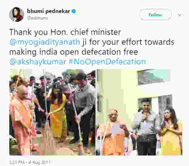 Akshay and Bhumi, both extended their support to his cleanliness drive, and even swept a school in Lucknow. Bhumi took to Twitter to share the pictures, and wrote, “Thank you Hon. chief minister @myogiadityanath ji for your effort towards making india open defecation free @akshaykumar #NoOpenDefecation.” [sic]