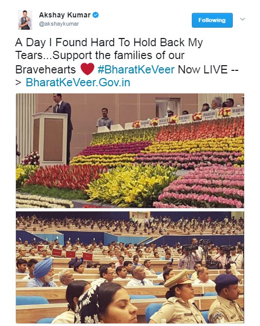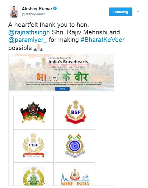 Further, he added, writing, “A heartfelt thank you to hon. @rajnathsingh,Shri. Rajiv Mehrishi and @paramiyer_ for making #BharatKeVeer possible ??. A Day I Found Hard To Hold Back My Tears…Support the families of our Bravehearts ❤ #BharatKeVeer Now LIVE –> http://BharatKeVeer.Gov.in.” [sic]