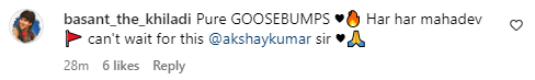 Another comment read, “Pure GOOSEBUMPS (heart and fire emoji) Har har mahadev (flag icon) can’t wait for this @akshaykumar sir (heart and folded hands emoji)”