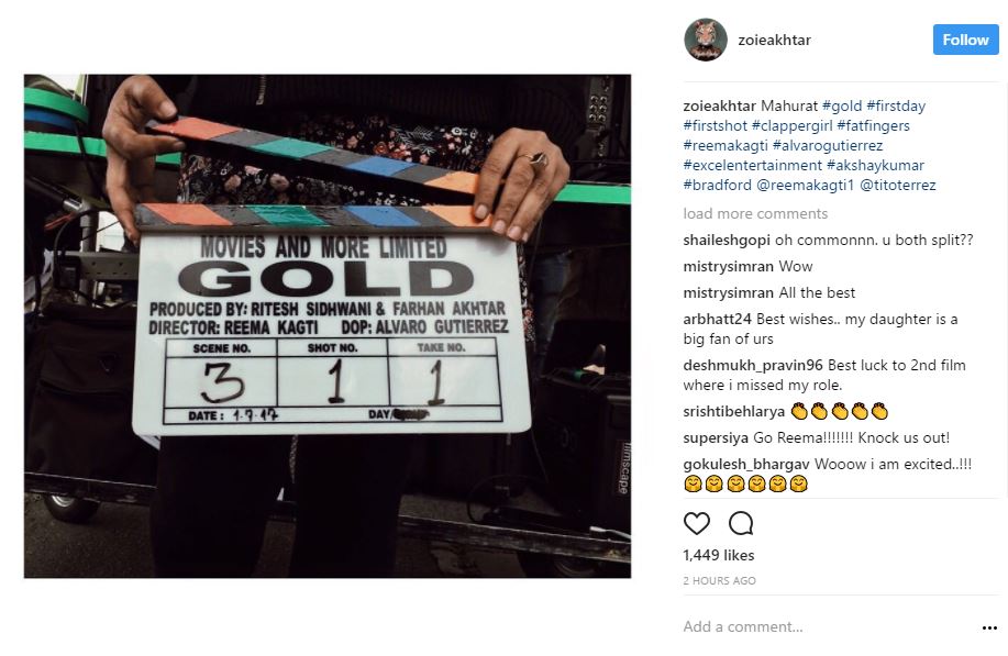 Zoya Akhtar on her Instagram page posted the picture of the clapboard and wrote, “Mahurat #gold #firstday #firstshot #clappergirl #fatfingers #reemakagti #alvarogutierrez #excelentertainment #akshaykumar #bradford @reemakagti1 @titoterrez.” [sic]