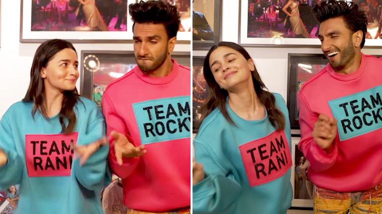 In a fun video, Ranveer and Alia are seen running to the Dharma Productions’ office to reach on time before the beat drop. While their playfulness is adorable, it’s their contrasting outfits that strike out. Alia is wearing a blue sweater with Team Rani written on a pink background, whereas Ranveer’s has this in reverse for Team Rocky. The actor’s rainbow jeans are just too cool.
