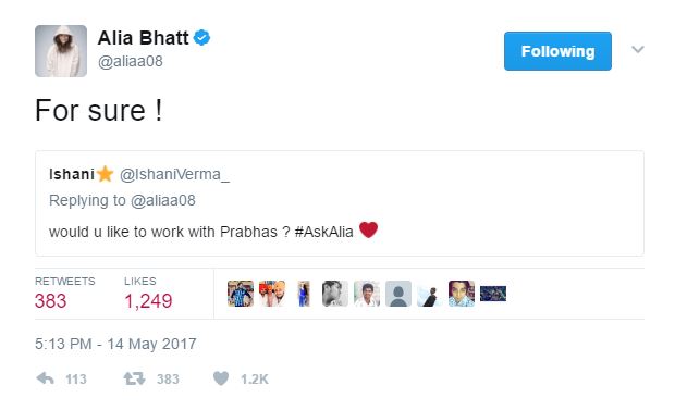 Later when another fan asked her, “would u like to work with Prabhas ? #AskAlia.” So, the actress replied, “For sure !”
