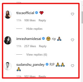 Similarly, celebs like Tisca Chopra, Rashami Desai, Sudhanshu Pandey and Hiten Tejwani also offered condolences.