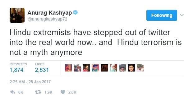 Anurag had tweeted, “Hindu extremists have stepped out of twitter into the real world now.. and Hindu terrorism is not a myth anymore.”