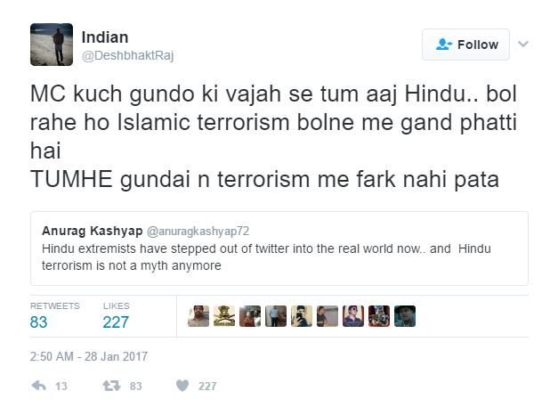 To this a person quote retweeted, “MC kuch gundo ki vajah se tum aaj Hindu.. bol rahe ho Islamic terrorism bolne me gand phatti hai, TUMHE gundai n terrorism me fark nahi pata.”