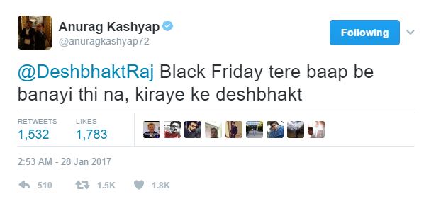 To which Anurag replied, “@DeshbhaktRaj Black Friday tere baap be banayi thi na, kiraye ke deshbhakt.”