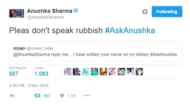 Anushka Sharma, who is riding high with the success of ‘Ae Dil Hai Mushkil’, recently interacted with her fans on Twitter in a #AskAnushka session. In the same, one of her fans made an idiotic comment which obviously irked the actress.