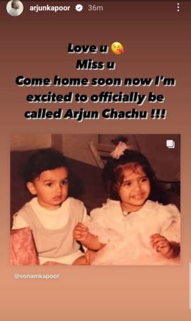Now, replying to Sonam, Arjun shared the post on his Instagram Story and wrote, “Love u Miss u Come home soon now I’m excited to officially be called Arjun Chachu!!!”