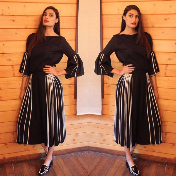 This Prabal Gurung ensemble is somewhere between pretty and could-have-been-better! Isn’t it? The designer Prabal is quite popular for his knack for design and must say, he has done a good job with these classic separates. That flirty gorgeous skirt and delicate strappy black heels complete the look. Athiya stuck to a no-accessories look and that kinda works well. Hmm, we wish she had added a hint of bold lip colour to brighten up the outfit a bit.