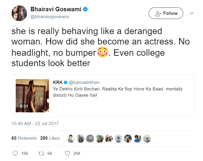 “she is really behaving like a deranged woman. How did she become an actress. No headlight, no bumper. Even college students look better,” Bhairavi wrote on Twitter. (Also Read: How Kriti Sanon became the perfect UP girl for ‘Bareilly Ki Barfi’)