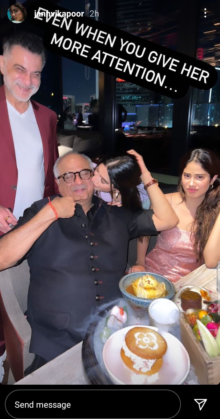 Janhvi shared two pictures to wish her dad on birthday. In the first picture, Boney can be seen kissing Janhvi on her cheeks. In the pic, Boney’s brother Sanjay Kapoor and Khushi are also seen posing for the camera. She captioned the picture, “Happy Birthday Father!! To the best man in the world. I love you.” In the other picture, Khushi can be seen kissing her dad, while Janhvi is making a face. Posting the picture the actress wrote, “Even when you give her more attention.”