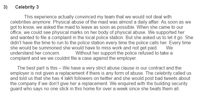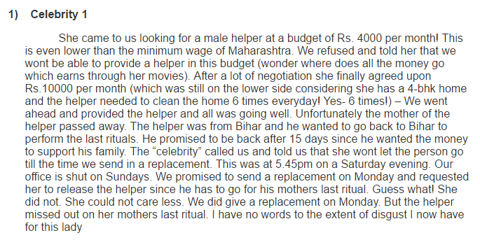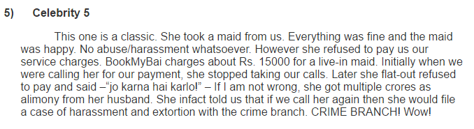 Well, he hasn’t picked on the names of the celebs, but described five horrendous incidents of physical abuse and misbehaviour towards the maids by the celebs. He says, “This piece that I am writing is to bring awareness of how some of these Bollywood celebrities exploit services. I know that I am generalising and weighing them all in the same scale. But I am only talking out of my personal experience of providing a domestic help to over 20 Bollywood celebrities in Mumbai. This is also to put in a word of caution to other buddy-startups who might fall into the trap and end up losing that precious revenue. As a matter of fact, now BookMyBai has a blanket ban on all Bollywood celebrities and we have instructed our team to not provide domestic helps to any of them.”