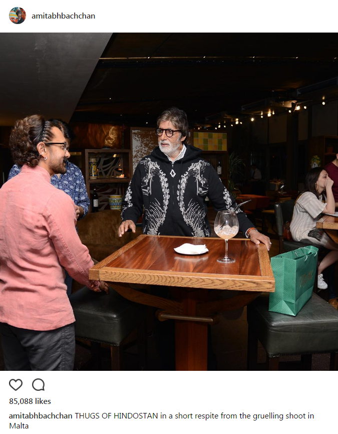Today, Mr Bachchan shared a picture on his Instagram page in which the two stalwarts are seen taking a short break from their hectic shooting schedule. He captions the picture as, “THUGS OF HINDOSTAN in a short respite from the gruelling shoot in Malta”. [sic] Here have a look: