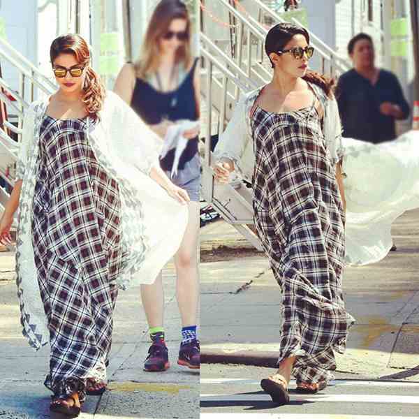 Before we tell you about what Priyanka is wearing, for the uninitiated, Gingham is a lightweight plain-woven cotton cloth, typically checked in white and a bold colour. Snapped while arriving on the sets and donning a gingham cami maxi dress along with a long white shrug and flip flops, PeeCee looked quite comfy in what she was wearing. Her cool beachy look was further complimented well with dark lips, reflector shades and the same side swept low back pony.