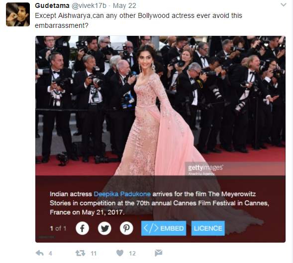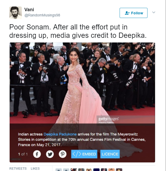 This has not come as a surprise to us at all! Foreign media has once again mistaken the identities of two Bollywood actresses. In recent past as well, we have witnessed how all ‘brown skin’ stars are the same to foreign media and this Cannes Film Festival 2017 proved that nothing has changed. So three Bollywood divas viz. Deepika Padukone, Sonam Kapoor and Aishwarya Rai Bachchan shone bright at the Cannes Film Festival 2017. But a certain section of media mistook Sonam Kapoor for Deepika Padukone. A famous American photo stock agency named Sonam Kapoor’s pictures as Deepika Padukone’s and stated, “Indian actress Deepika Padukone arrives for the film ‘The Meyerowitz Stories’ in competition at the 70th Annual International Film Festival in Cannes, France on May 21, 2017.”