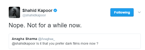 Then, when a fan asked him, “Is it that you prefer dark films more now?” Shahid replied by saying, “Nope. Not for a while now.” Here’s the tweet: