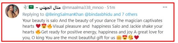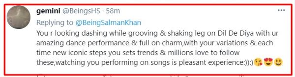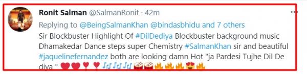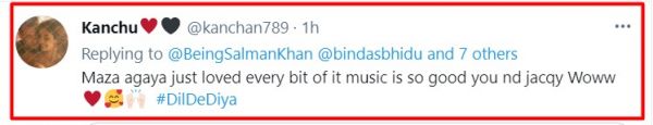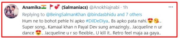 Gushing about Salman’s dashing look and funky steps, one of the fans wrote, “Hum ne to bohot pehle hi apko #DilDeDiya.. Bs apko pata nahi… Super song.. Kamaal khan n Payal Dev sung amazingly.. Jacqueline n ur dance. Jacqueline u r so flexible.. U kill it.. Retro feel maja aa gaya..(sic).”