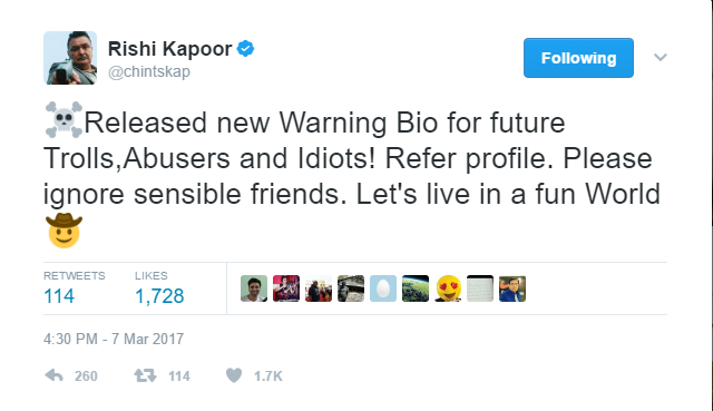 “Don’t you dare try Trollers and Abusers! You will be abused and BLOCKED-your loss if you following me.Don’t like me,unfollow me.Signed-Terrorist of the family,” his bio reads. (Also Read: Is Rishi Kapoor sending abusive messages to women on Twitter?)