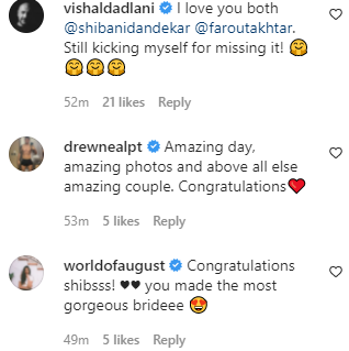 In the photos, both Shibani and Farhan looked head-over-heels in love with each other. Apart from millions of fans, Bollywood celebrities also showered love on the newly-married couple. Reacting to the pictures, B’Town celebrities including Neha Dhupia, Dia Mirza, Huma Qureshi, Richa Chadha, Pulkit Samrat and many others showered the newlyweds with a lot of love.