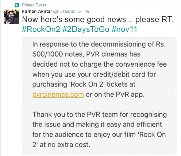 Prime Minister Narendra Modi has banned the currency notes of Rs 500 and Rs 1000 with effect from today. Many B-Town celebs have also showered their praises upon this decision taken by the Government. But looking at the changes occurring in due to this situation, the chain of PVR Cinemas have decided upon an important step related to this Friday’s big release ‘Rock On 2’. The cinema halls have decided not to charge any convenience fee on the usage of a debit or credit card for the purchase of tickets for this musical drama film.