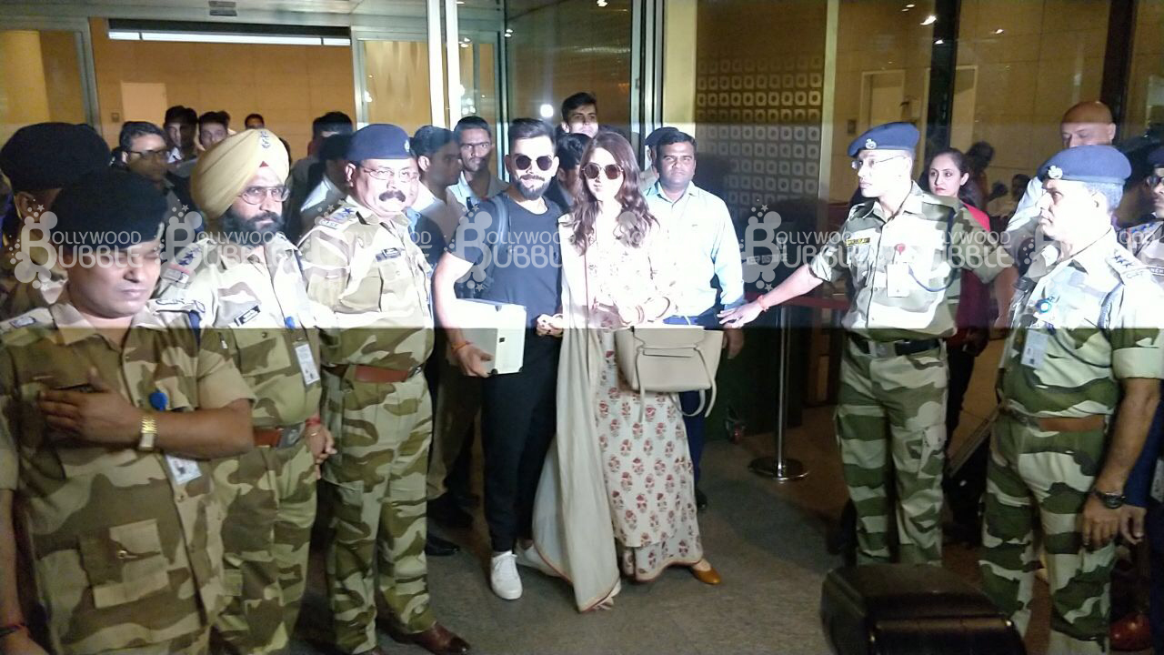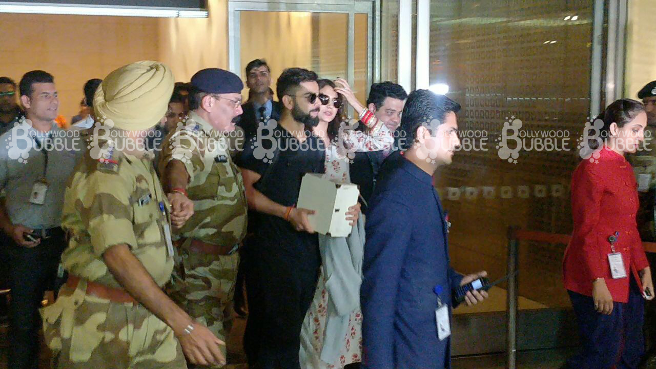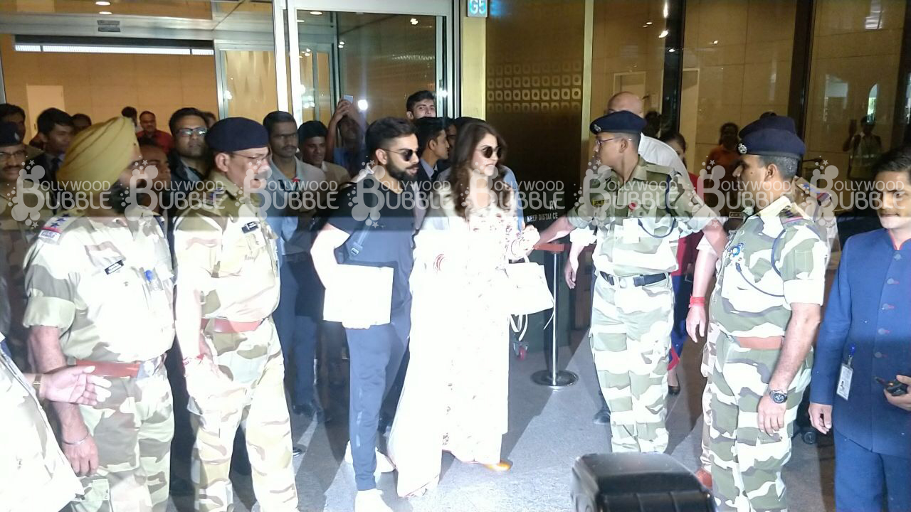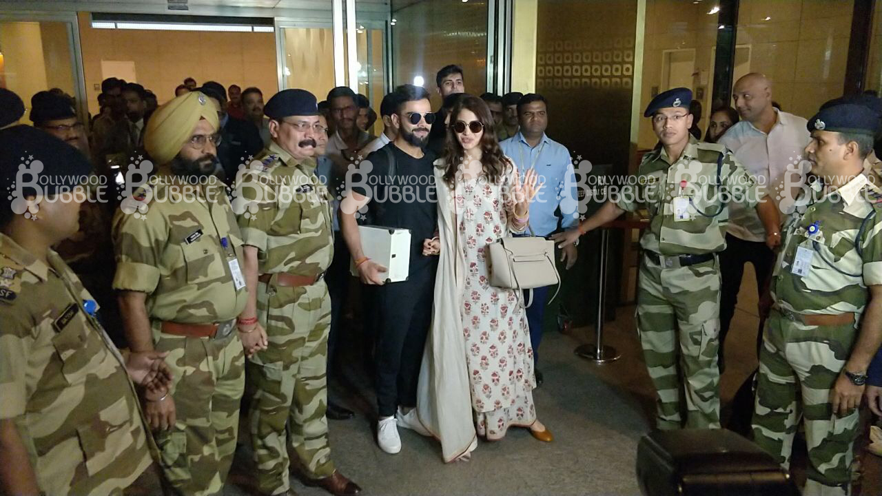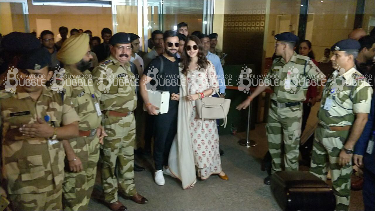 Newlyweds Virat Kohli and Anushka Sharma are back in town after a gala wedding reception in Delhi last night. The duo were all happy and smiling for the shutterbugs who went clickety-click. We got exclusive pictures of the duo from Mumbai airport. Virat was wearing a basic black tee and black pants which he teamed up with white shoes while Anushka was wearing salwar kameez and looked beautiful as a new bride. The duo was wearing identical black shades and looked adorable together. (Also Read: Virat and Anushka’s reception décor is one dreamy affair! View INSIDE PICS)