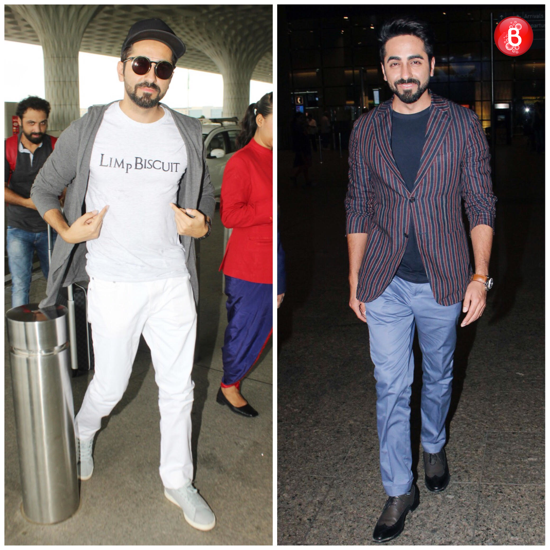 Smiling for the shutterbugs and not once, but spotted twice at the airport this week was Ayushmann. We loved how the actor tried and opted for two very different looks. But, according to us, his airport style on the left (in the picture) didn't impress us. While, we liked how he added that striped element to his semi-formal attire on the right. But, wearing a light quoted tee on white pants, seemed a bad pick to us. Style score-2.5/5!