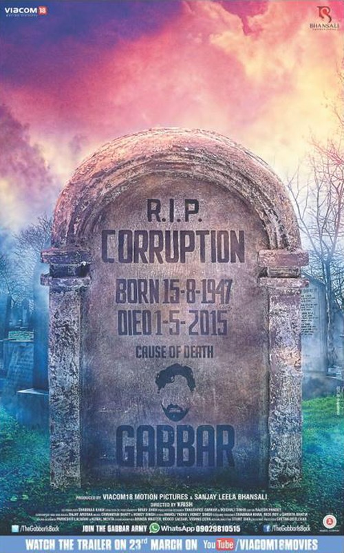 In the recent posters of ‘Gabbar Is Back’ we had nothing more than the outline of Akshay’s bearded face. These posters were put on at several hot spots in Mumbai. Now another poster that shows a tombstone of corruption has been revealed. There is also a death date May 1, of corruption , it is the release date of the film.