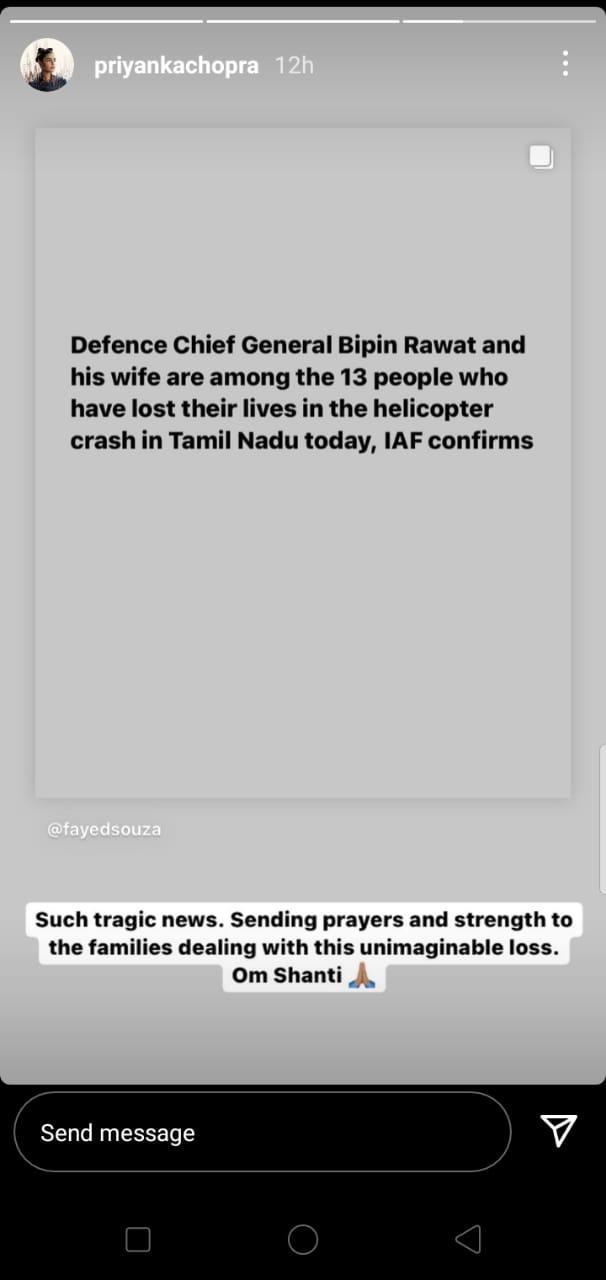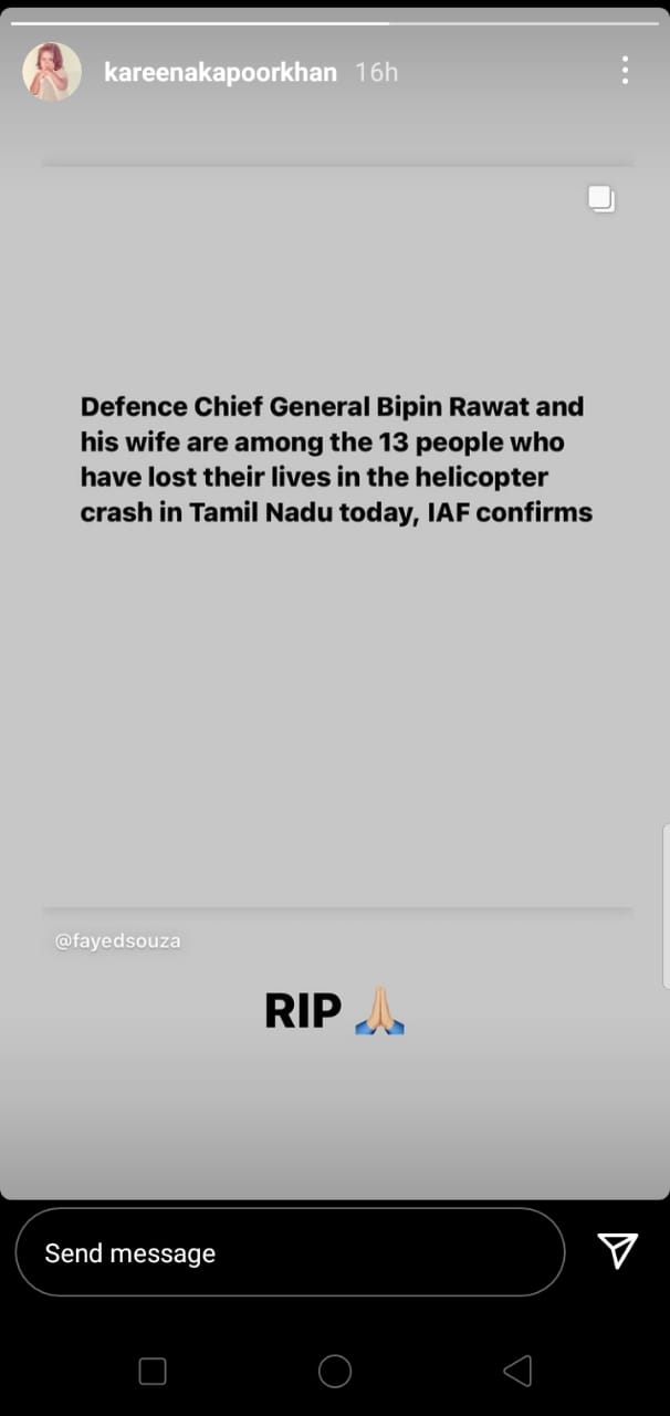 Kareena Kapoor Khan and Priyanka Chopra also condoled the demise of Bipin Rawat and others.