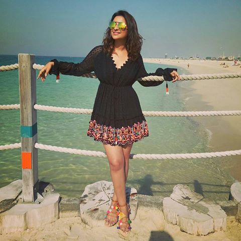 Parineeti was spotted soaking in the sun and going easy breezy in Dubai. She kept it casual with reflector shades, tousled hair in tow and pom pom sandals from Lulu & Sky.