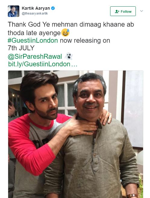 Kartik took to Twitter to inform everyone about it. Along with a picture of himself and Paresh Rawal, the actor tweeted, “Thank God Ye mehman dimaag khaane ab thoda late ayenge? #GuestiinLondon now releasing on 7th JULY @SirPareshRawal.”