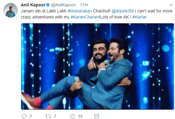 Anil will next be seen playing the character of Kartar Singh in the family comedy ‘Mubarakan‘, where he will be seen alongside nephew Arjun Kapoor, and it is on his nephew’s birthday today, that chachu Anil Kapoor unleashed his quirky side and wished him Mubarakan style, on social media.