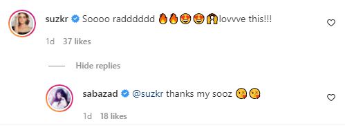 Calling her Sooz, Saba said, “@suzkr thanks my sooz” Check out the comments here: