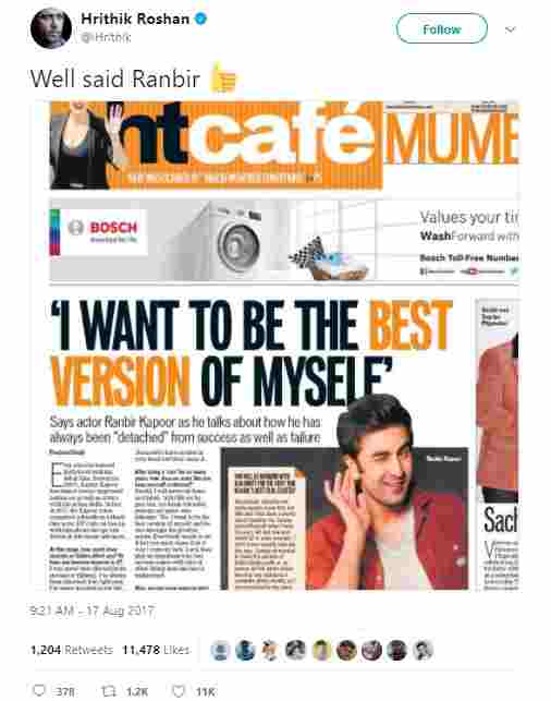 On this note, when Ranbir Kapoor, in an interview with HT Cafe said he wanted to be the best version of himself, Hrithik took to Twitter and lauded his words. “Well said Ranbir ,” he wrote.