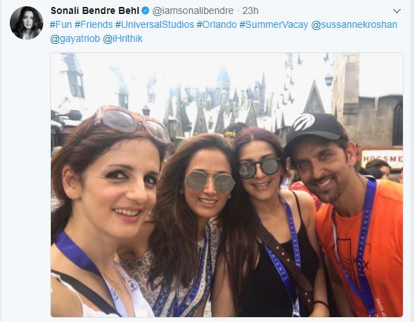 Sonali Bendre took to her Twitter account, posted a picture, and wrote, “#Fun #Friends #UniversalStudios #Orlando #SummerVacay @sussannekroshan @gayatriob @iHrithik.”
