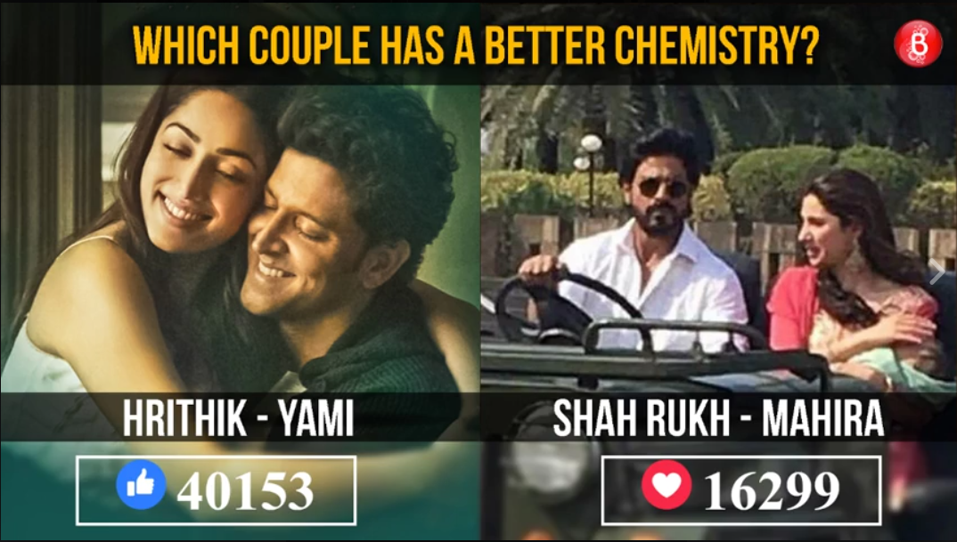So, as the trailer of both the films were out, we did a live poll on our Facebook page, where we asked our audience which couple has a better chemistry. Well, the results are out and we are not surprised. Hrithik-Yami’s jodi has won the poll with a large margin.