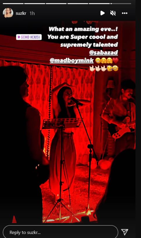 Sussanne Khan had shared a number of pics on her insta story. It featured her father Sanjay Khan, brother Zayed Khan, sister Farah Khan Ali, mother Zarine and others. The last post was all about Saba standing in front of a mic and performing. Looks like, after her outings with Hrithik, Saba is spending time with his ex-wife Sussanne.