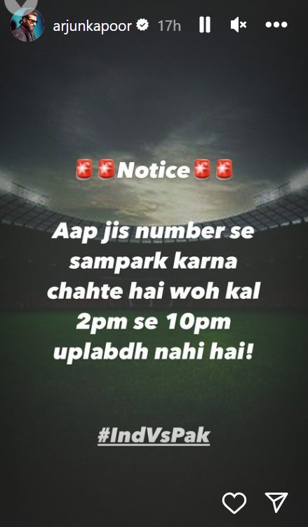 Arjun Kapoor had just another level of excitement as he showed it even a day prior. The actor took to his Instagram stories and put up a hilarious notice. It read, “Aap jis number se sampark karna chahte hain woh kal 2 pm se 10 pm uplabdh nahi hai (the number you want to contact is not available from 2 pm to 10 pm) #IndvsPak.”